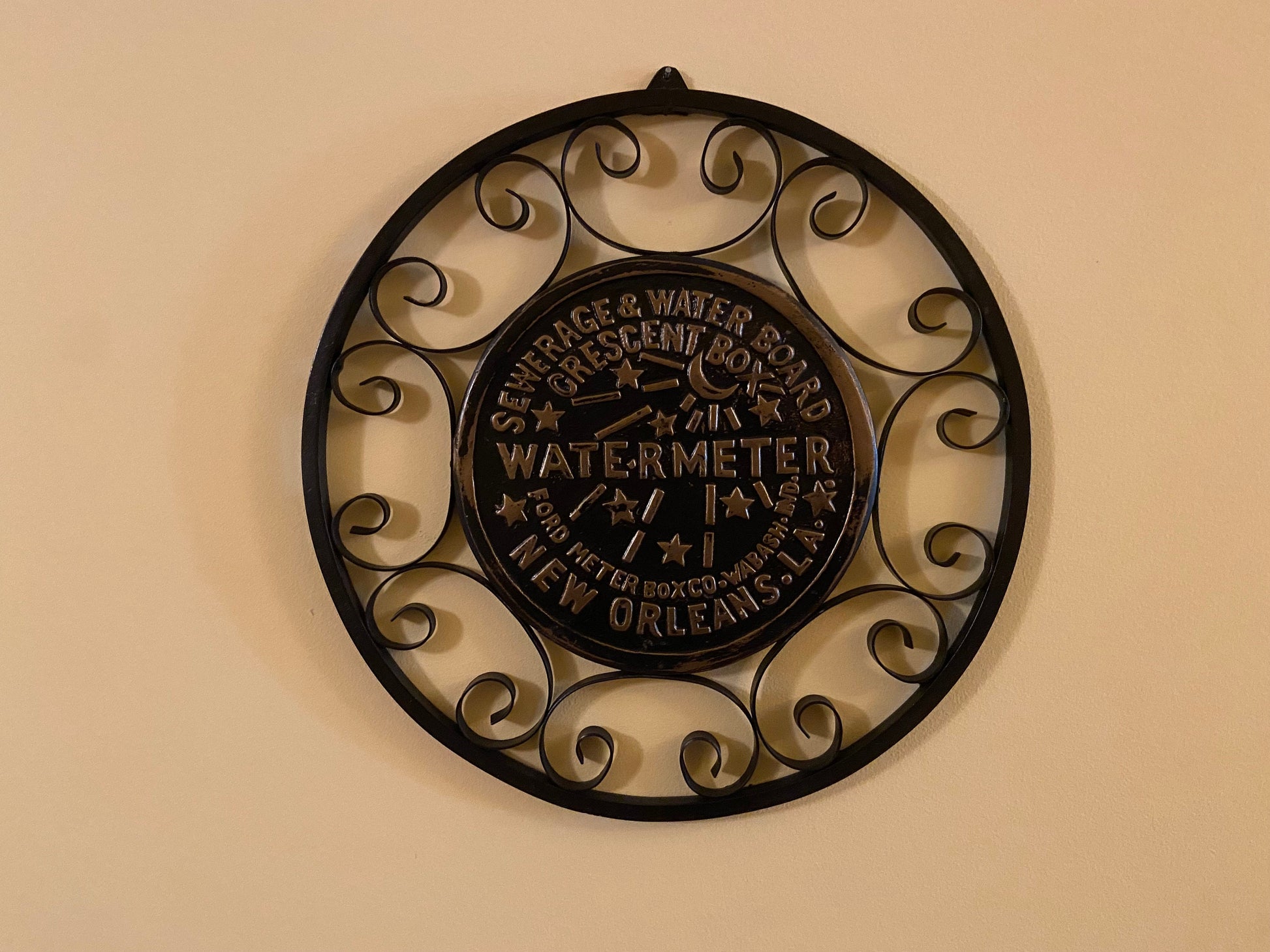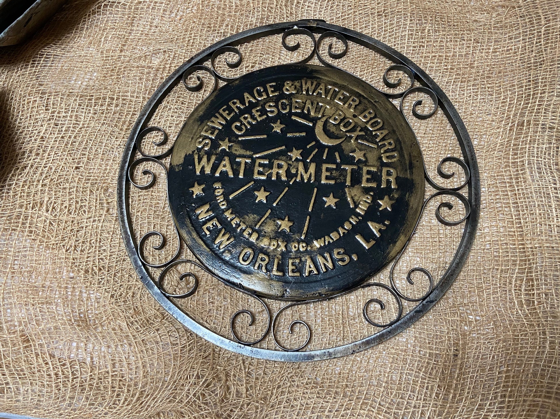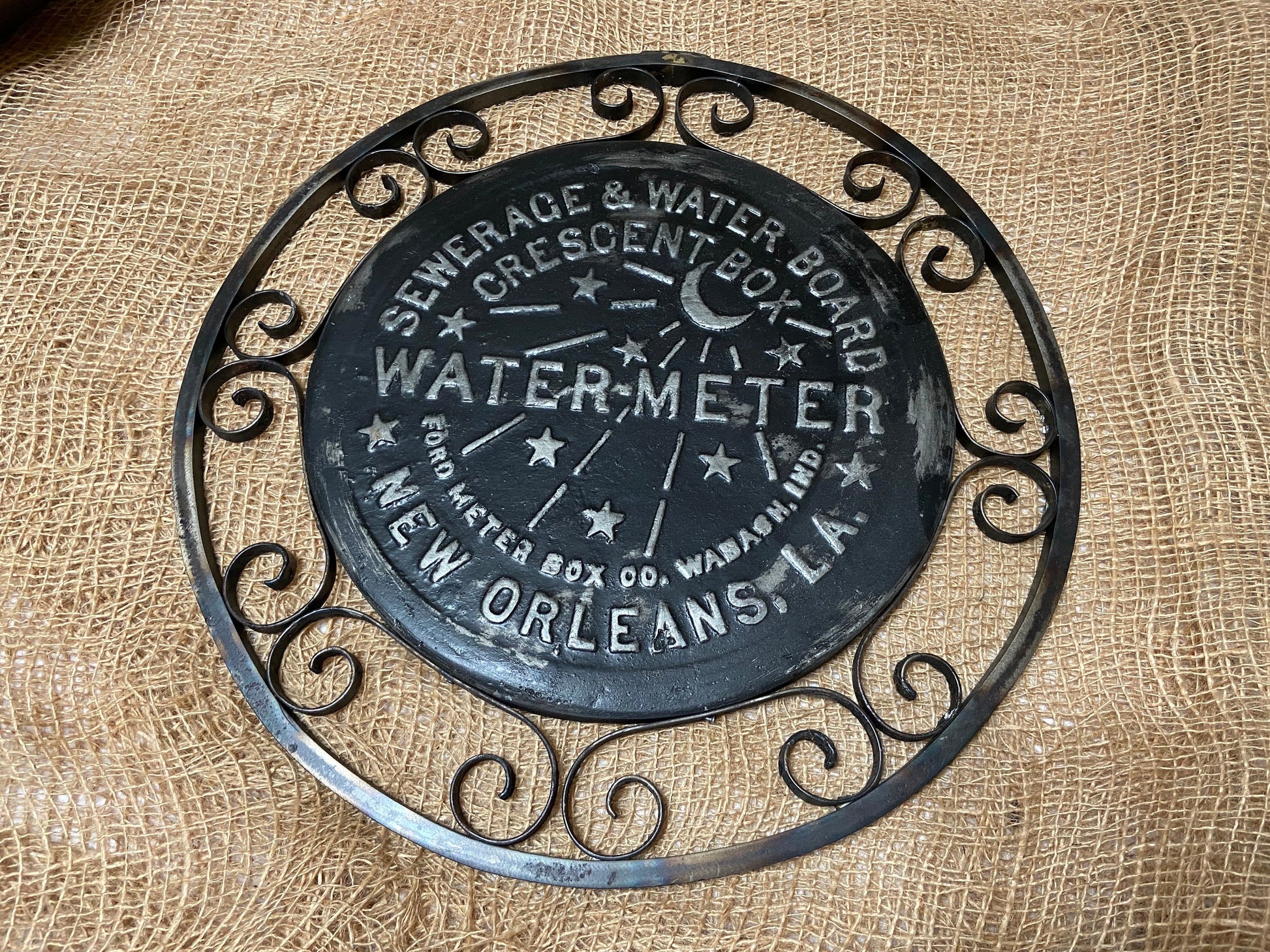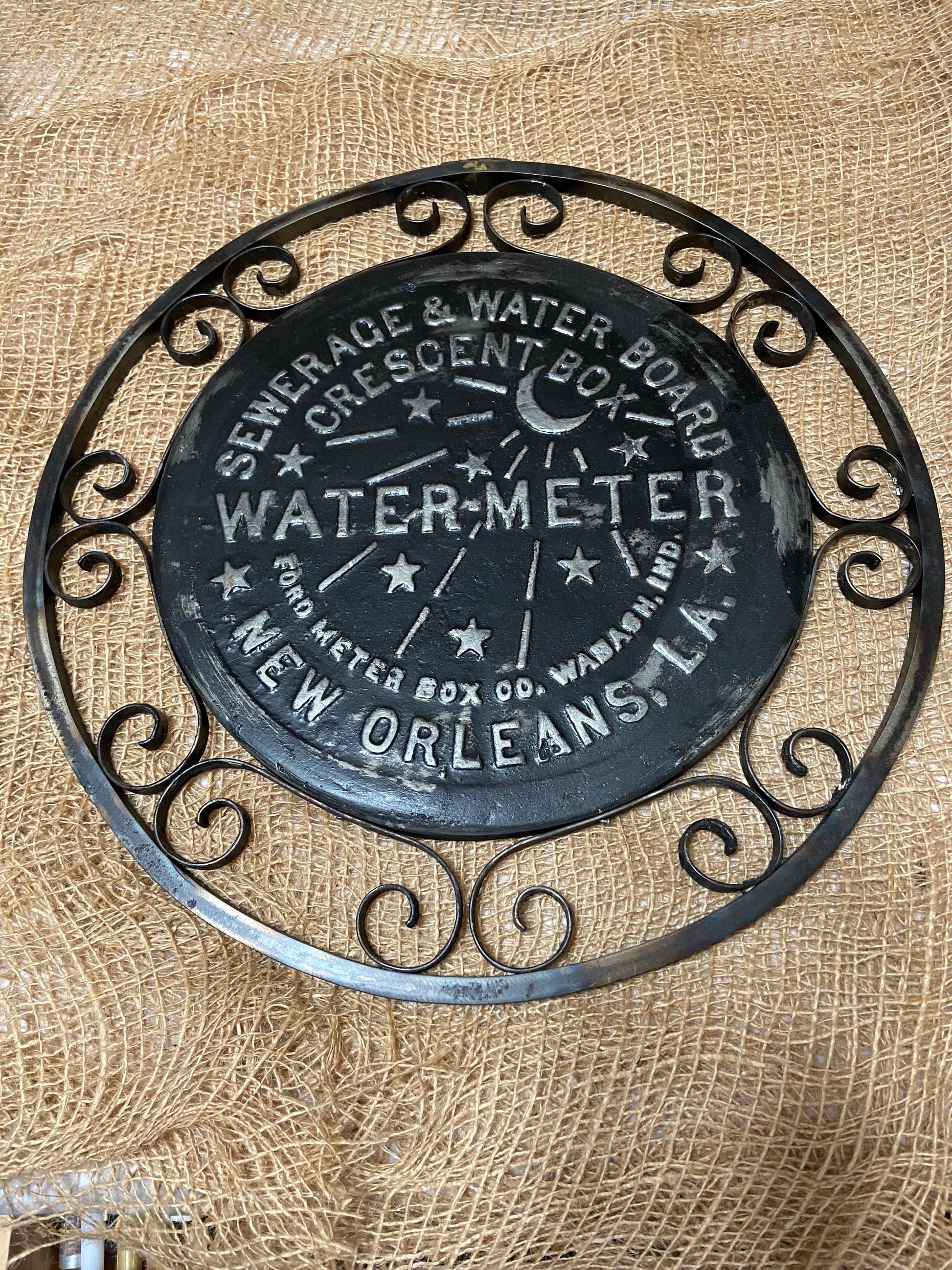 We have taken our now famous New Orleans French Quarter water meter cover and embellished it with hand crafted iron lace work. These are our same fiberglass castings on wood with the same antique finish. The meter cover measures 11 1/2 in diameter. When you include the iron work, the overall diameter is 16. This piece is so unique and beautiful! We are now making the smaller version of the meter cover (8 1/2) center piece and 14 1/2 diameter. Both come ready to hang with a nail point and also a Command strip on the back to keep it firmly attached to the wall. Both pieces weigh less than 4 pounds.