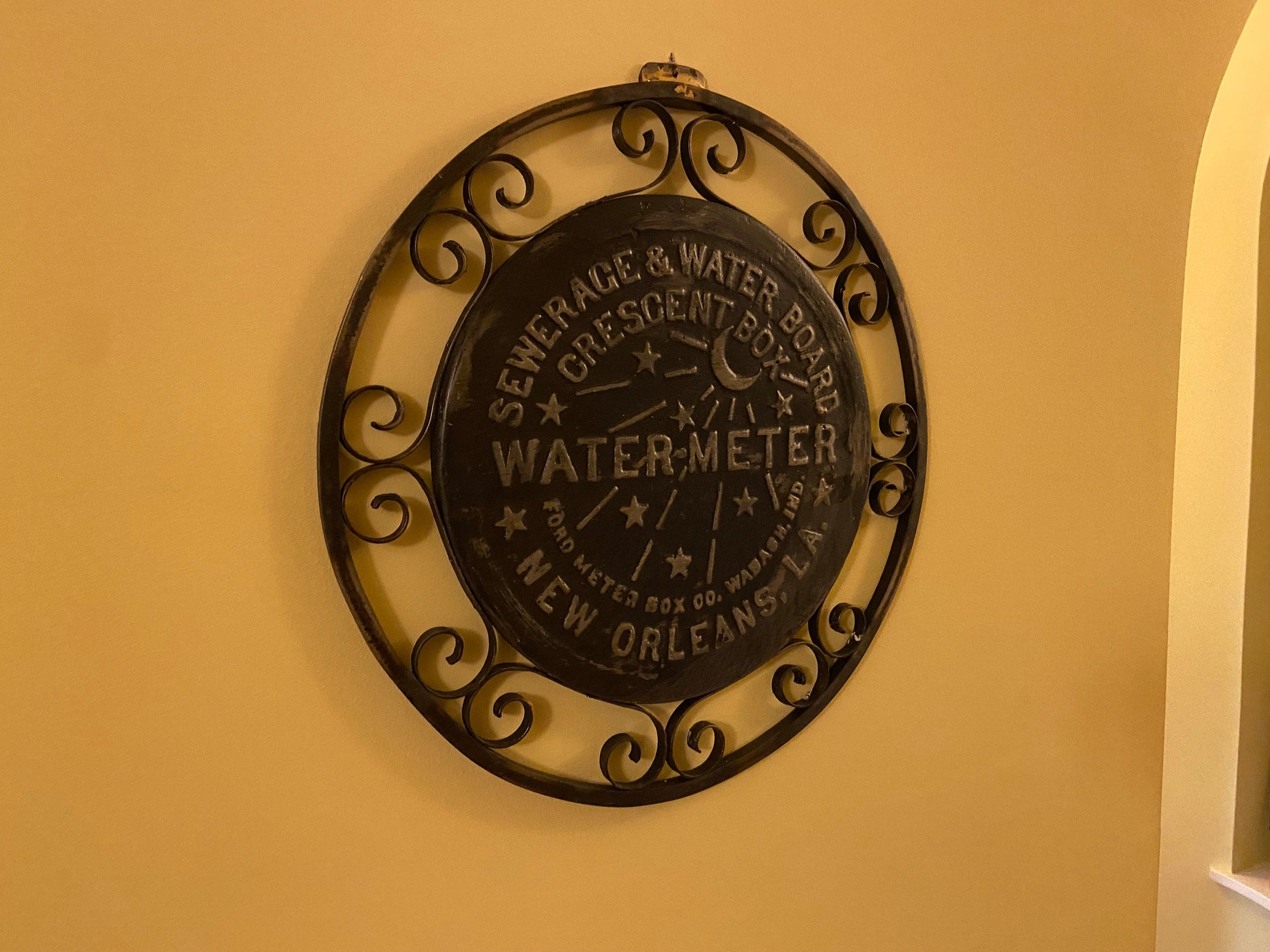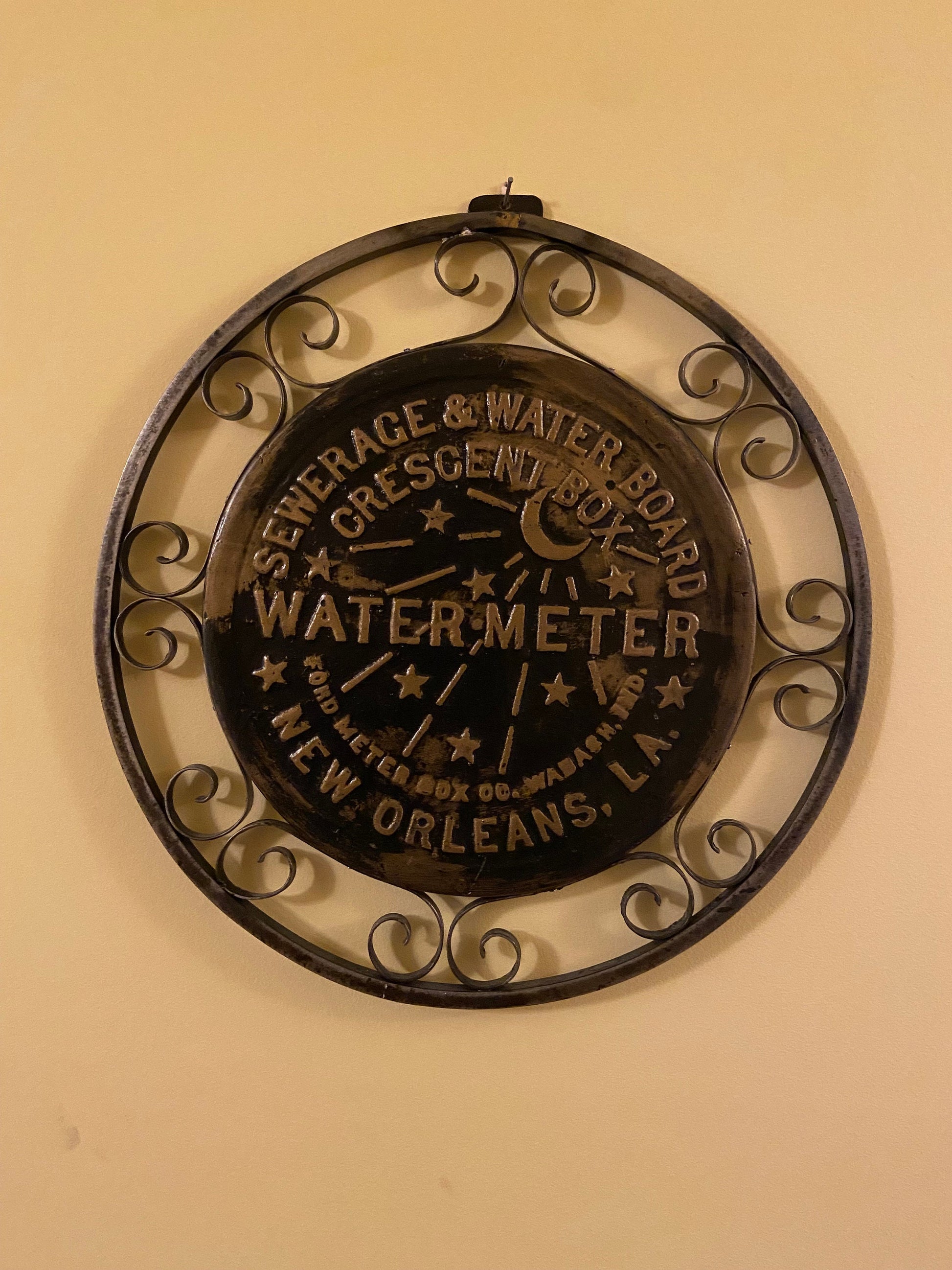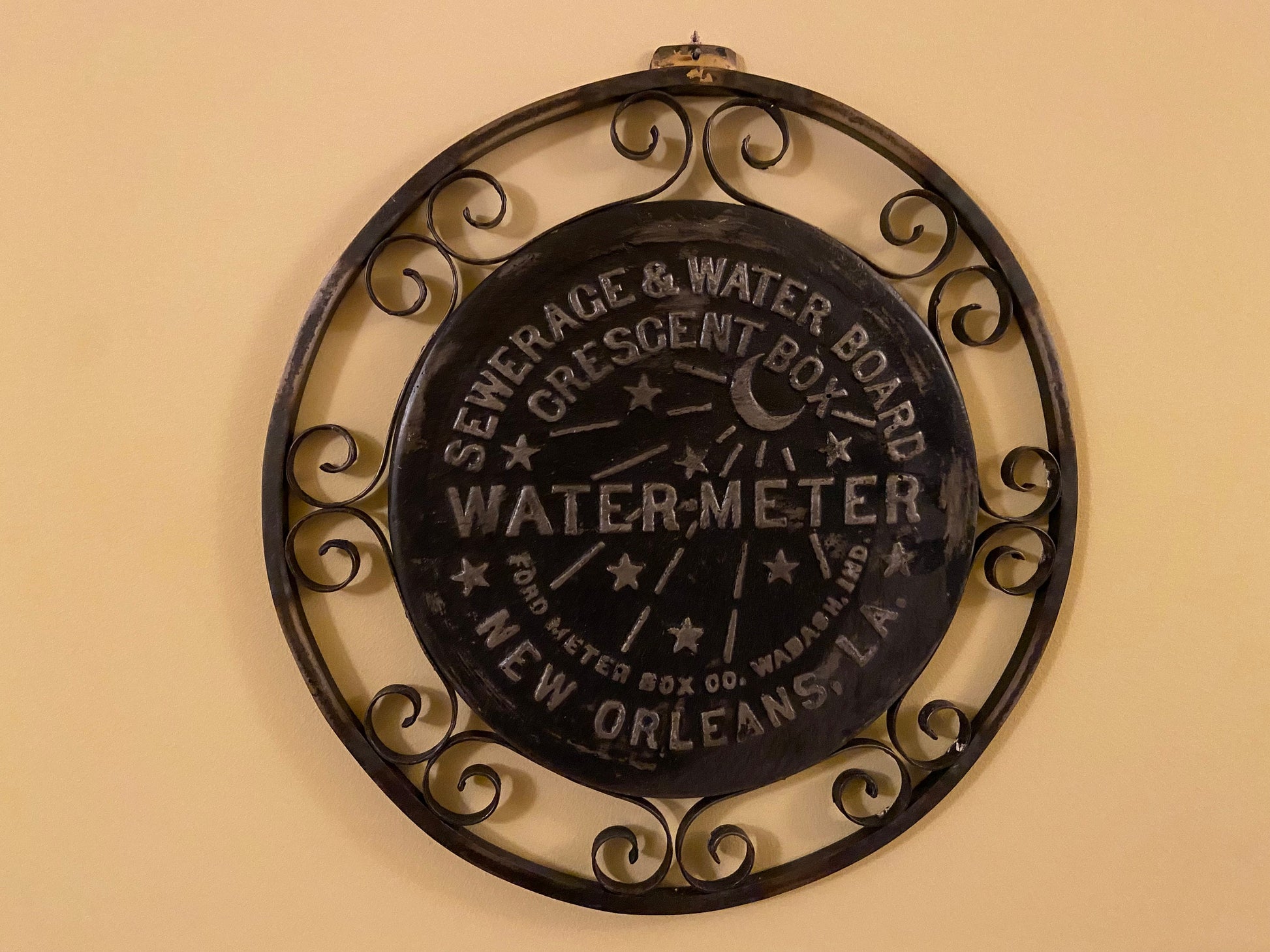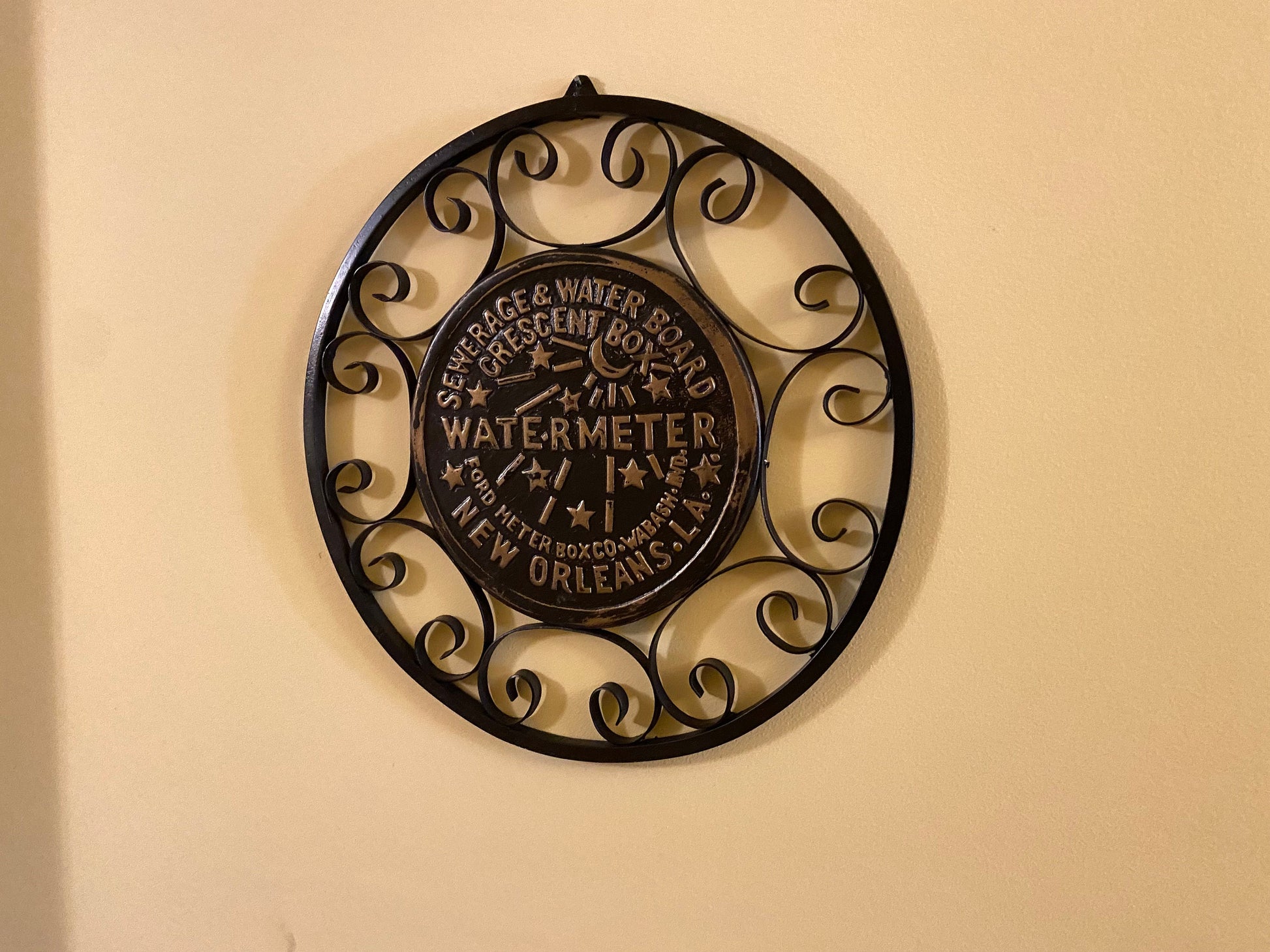 We have taken our now famous New Orleans French Quarter water meter cover and embellished it with hand crafted iron lace work. These are our same fiberglass castings on wood with the same antique finish. The meter cover measures 11 1/2 in diameter. When you include the iron work, the overall diameter is 16. This piece is so unique and beautiful! We are now making the smaller version of the meter cover (8 1/2) center piece and 14 1/2 diameter. Both come ready to hang with a nail point and also a Command strip on the back to keep it firmly attached to the wall. Both pieces weigh less than 4 pounds.